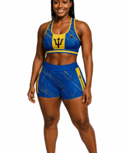 Barbados-Inspired Women’s Fitness Set – Blue & Gold Athletic Crop Top and Shorts