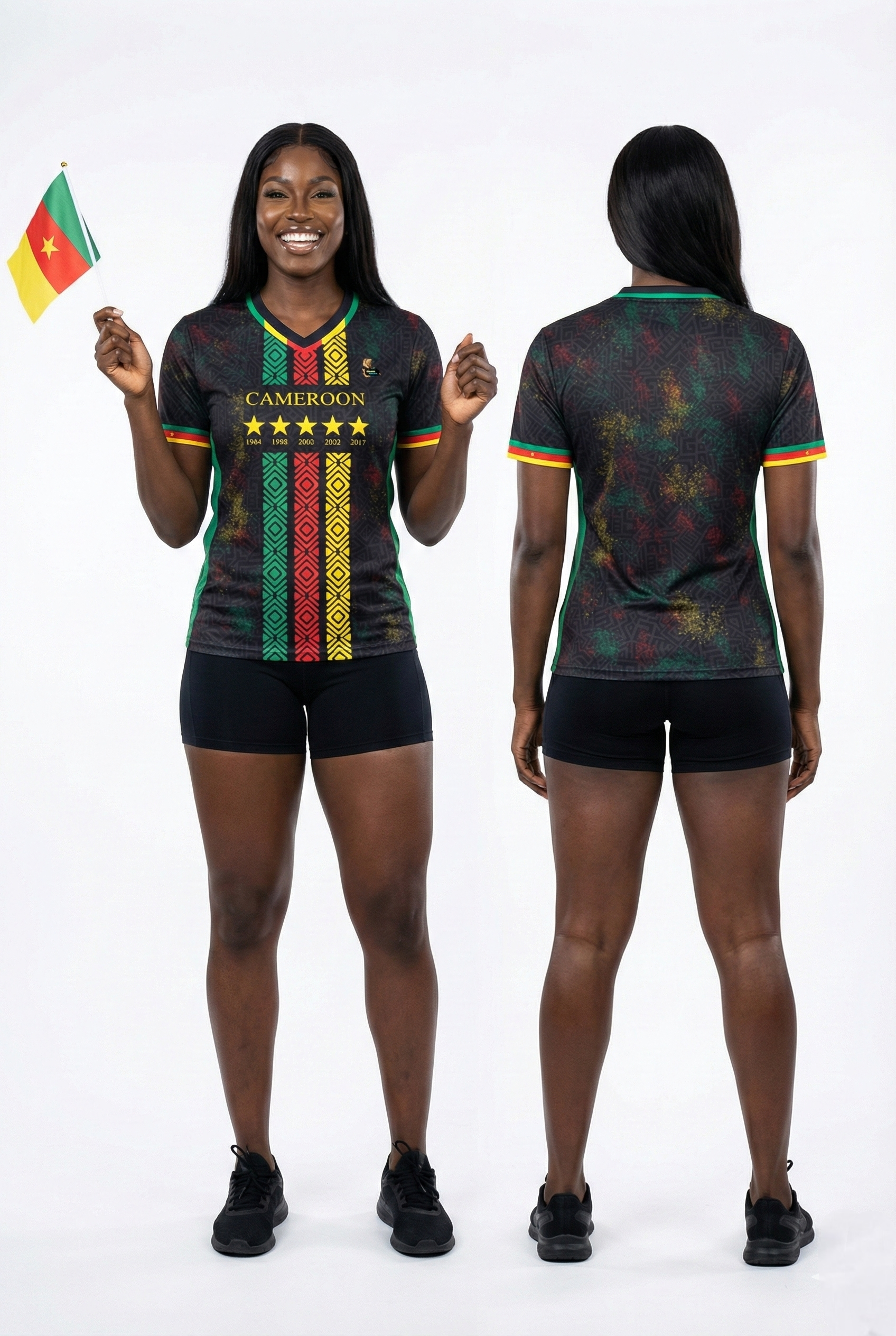 Celebrate African pride and football heritage with this Cameroon Heritage Jersey, a bold fusion of sport, culture, and modern streetwear. Inspired by the iconic green, red, and yellow of Cameroon’s national colors, this jersey features striking vertical tribal patterns and a paint-splatter texture that symbolizes energy, resilience, and movement. The 5 stars symbolizes the number of times they won the African football championship and the years