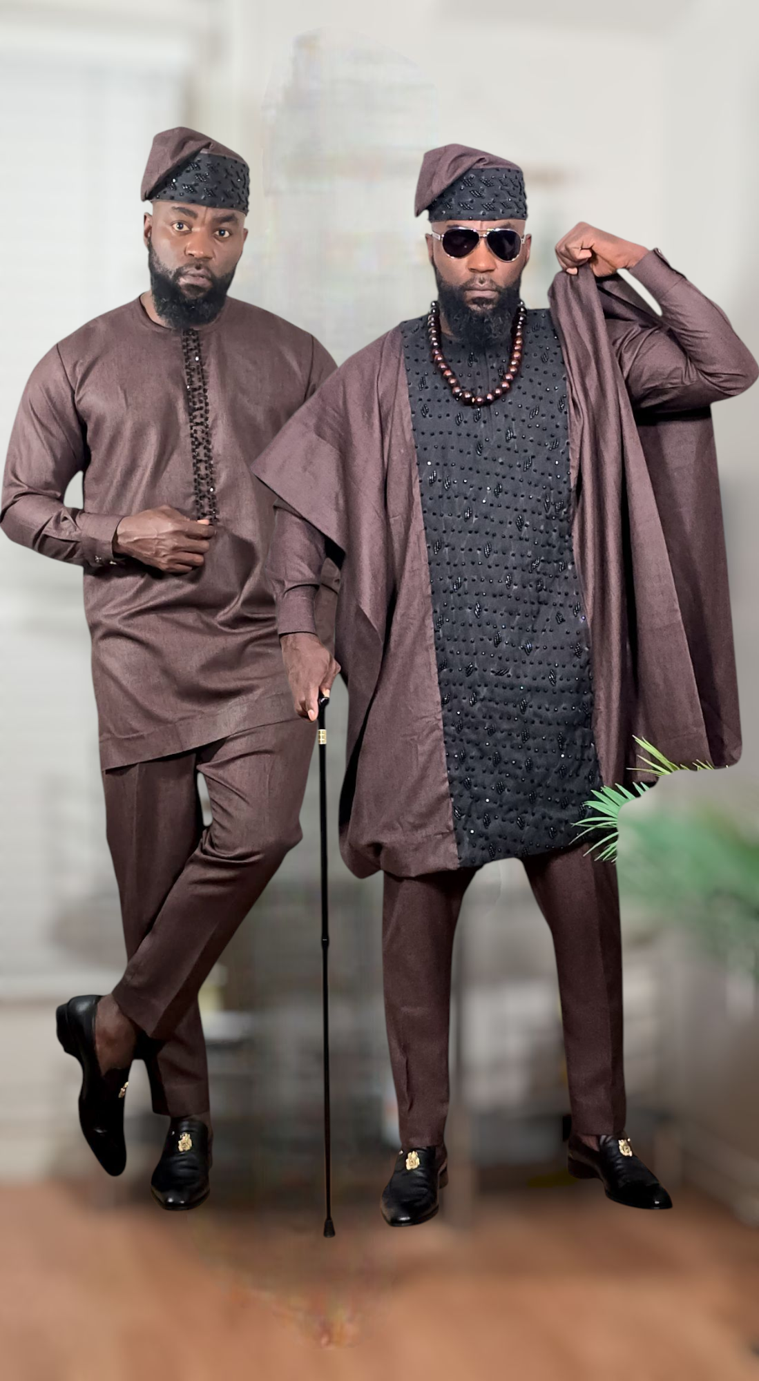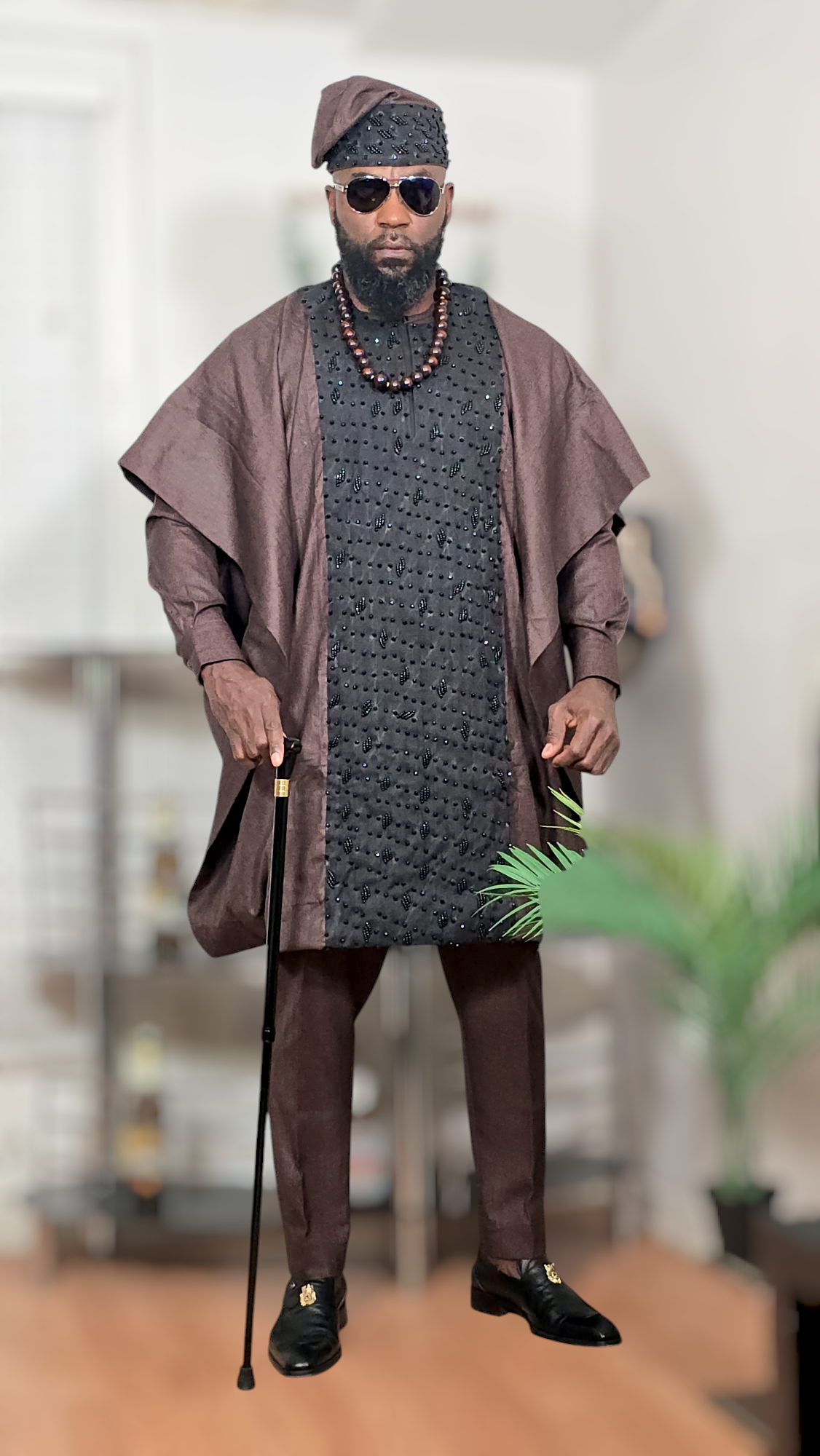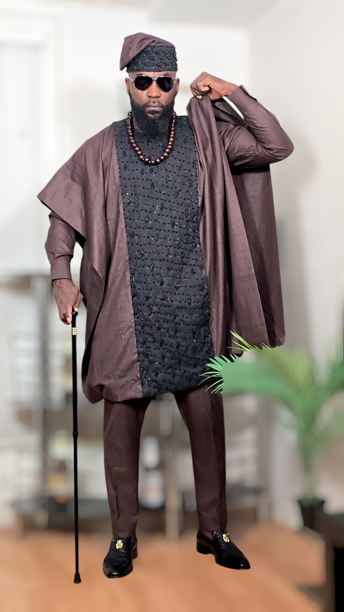 This unique piece blends African cultural heritage with luxury fashion, making it perfect for weddings, engagements, traditional ceremonies, cultural festivals, birthdays, and high-class events. The rich brown tones and detailed beadwork ensure a bold, majestic presence, while the stylish cap (fila) and modern accessories elevate the look to royalty.