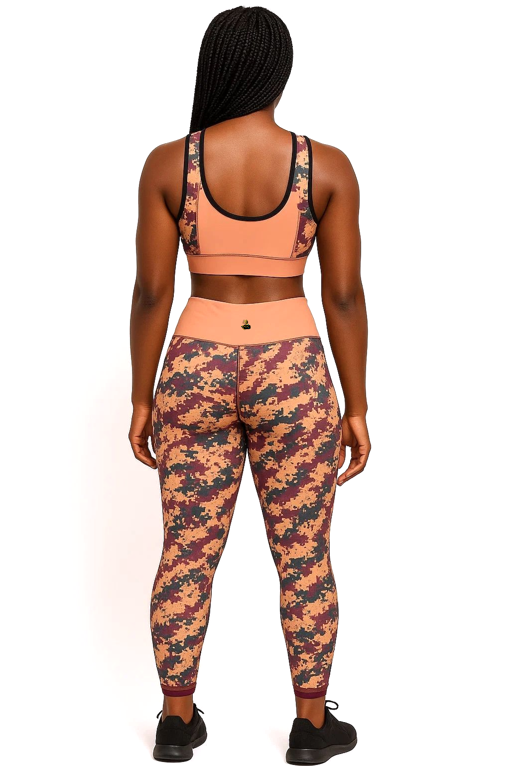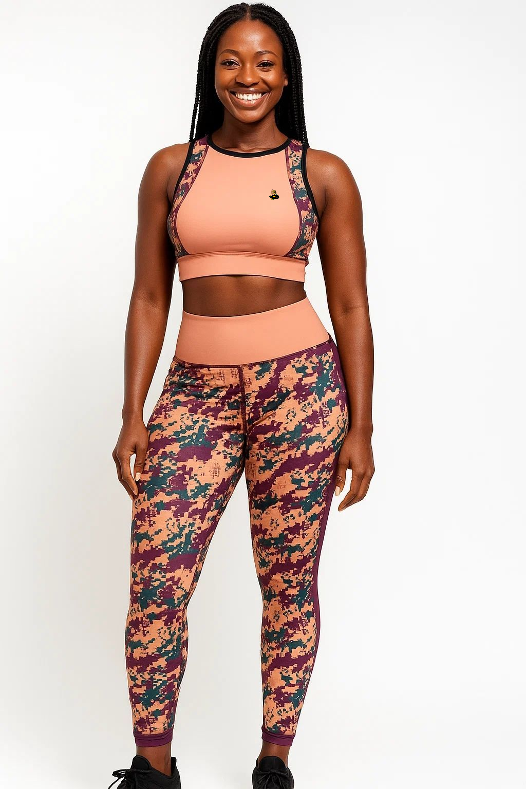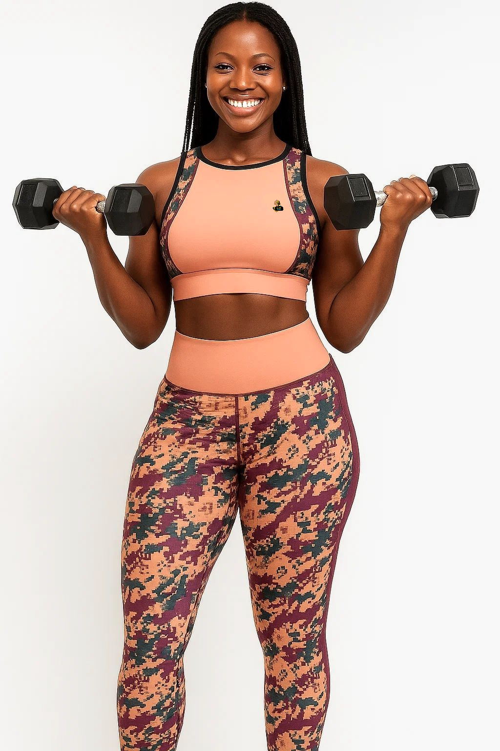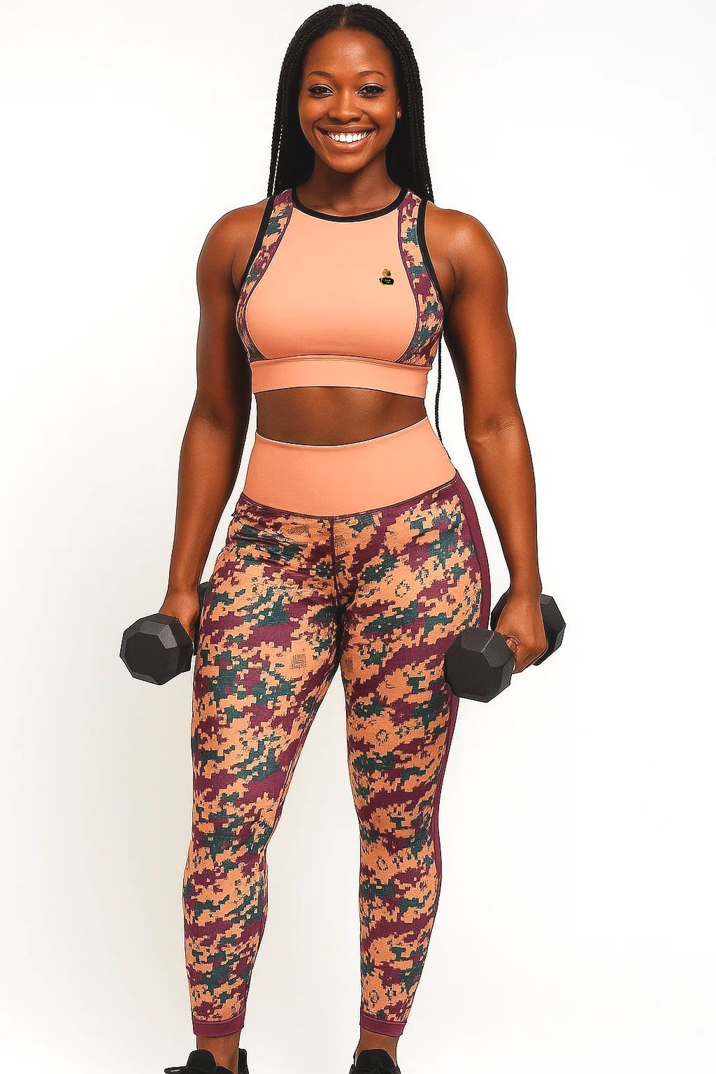 The sport bra top features a supportive fit with a bold peach base accented by digital camo straps, while the high-waisted camo leggings sculpt and flatter your figure with a flexible, squat-proof design. Perfect for the gym, yoga, running, or casual streetwear, this set is breathable, quick-drying, and built to move with you.