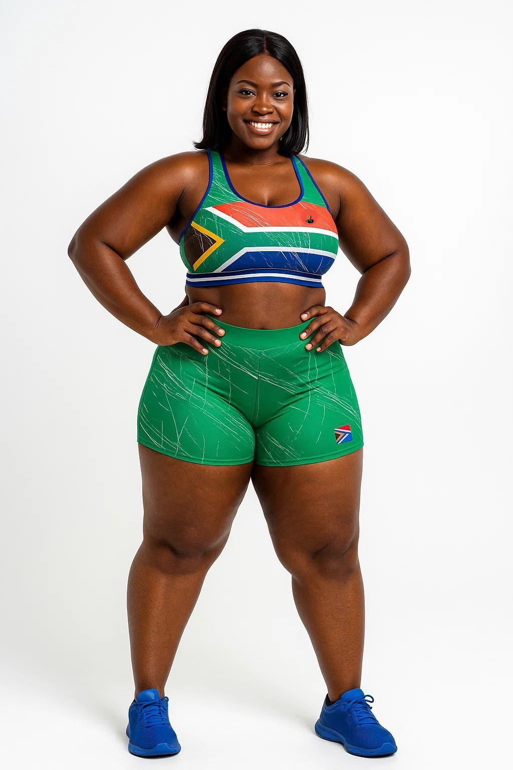 Show your strength and national pride with this bold South African flag-inspired activewear set. Designed for performance and confidence, this athletic outfit features a vibrant sports bra and matching shorts crafted for comfort, flexibility, and durability. Whether you’re training, competing, or just living your active lifestyle, this set celebrates the spirit of South Africa — strength, unity, and passion. Perfect for gym sessions, outdoor workouts, and fitness photoshoots.